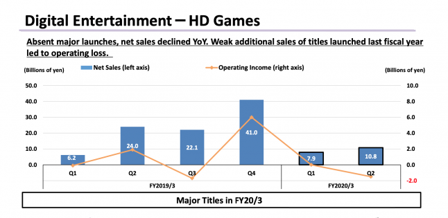 Despite that overall upturn within the division, net sales in the HD Games sub-segment fell to 10.8 billion yen ($98.8 million) in Q2 2019 from 24 billion yen ($219.5 million) in Q2 2018. Square Enix attributed the decline to an absence of major launches and weak additional sales of recent catalog titles (as shown in the graph below).